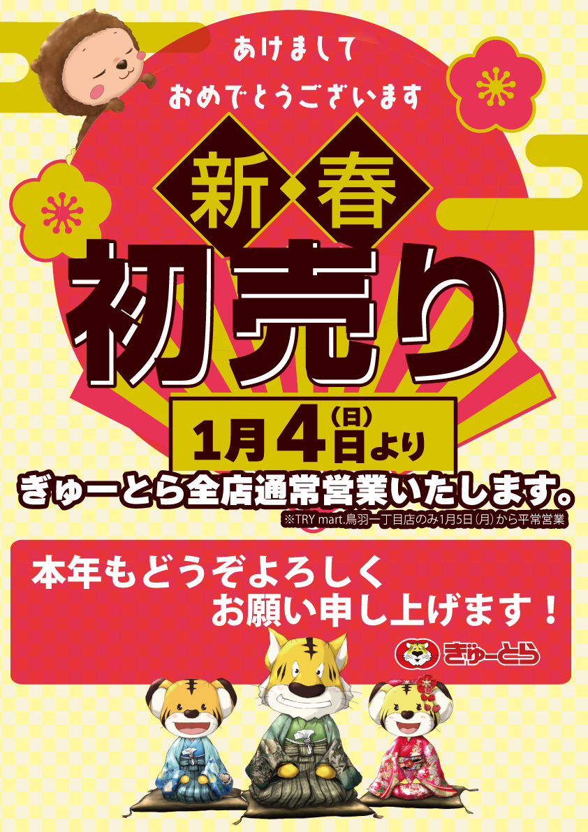 お知らせ 2026年 ぎゅーとら新春初売り 1月4日(日)より通常営業スタートいたします!