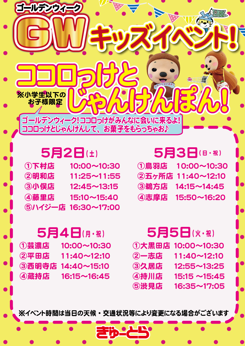 お知らせ 来店情報・イベント出演情報 2026.04.27 ■来店情報ゴールデンウィーク特別企画!キッズイベントを開催いたします!ココロっけとじゃんけんをして、お菓子をもらっちゃお♪(小学生以下のお子様限定)ぜひ、ココロっけに会いにきてくださいね!皆様のご来店、心よりお待ちしております。