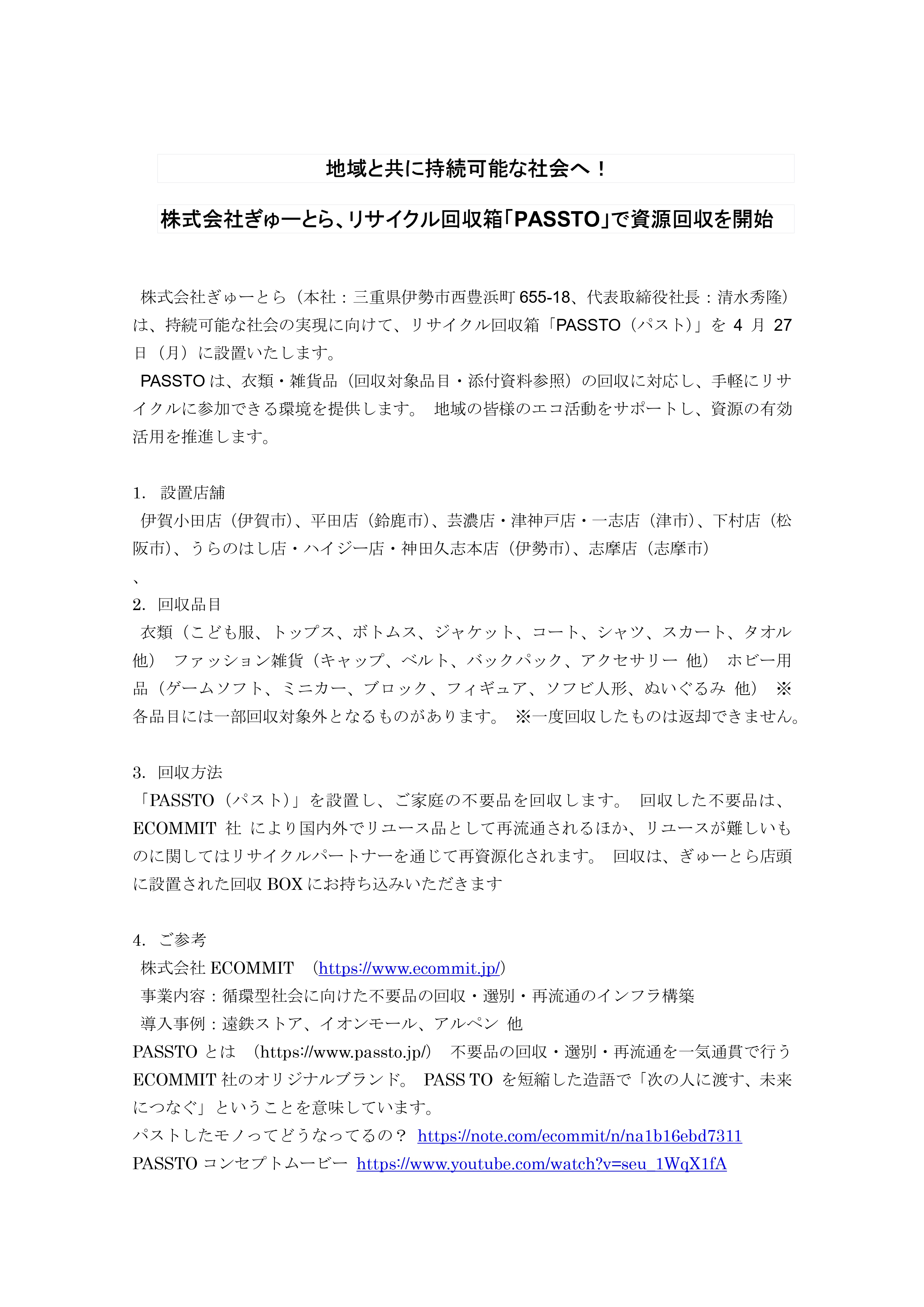 ぎゅーとらリサイクル回収箱「PASSTO」で資源回収を開始のお知らせ