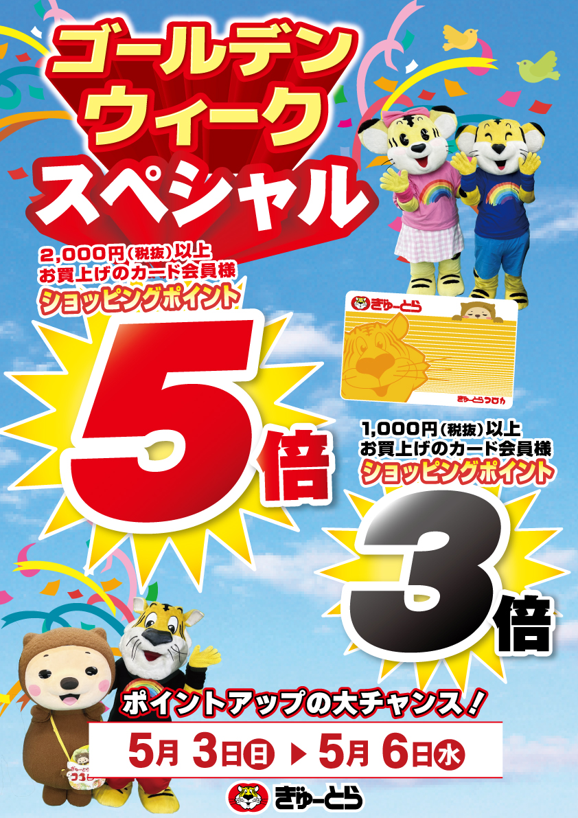 またゴールデンウィーク5月2日(土)~5月6日(水)の期間はスペシャルポイント3倍5倍デーを開催いたします!